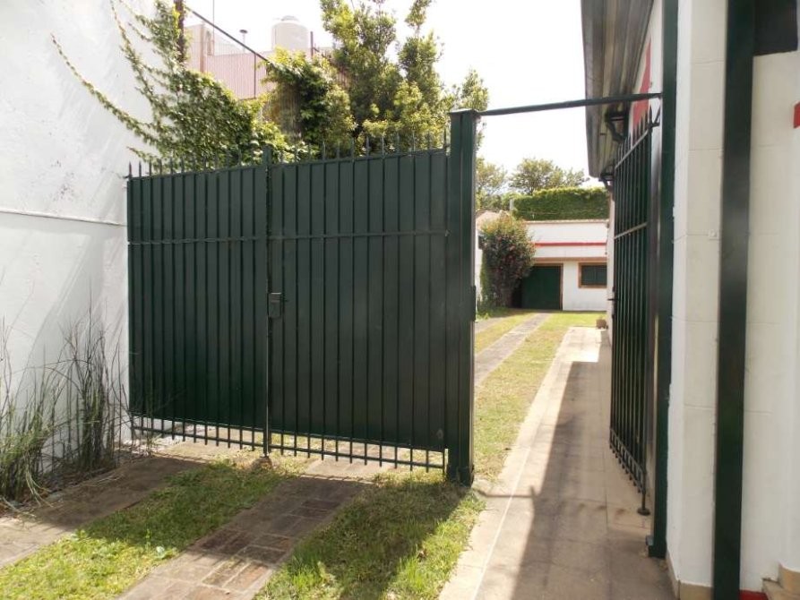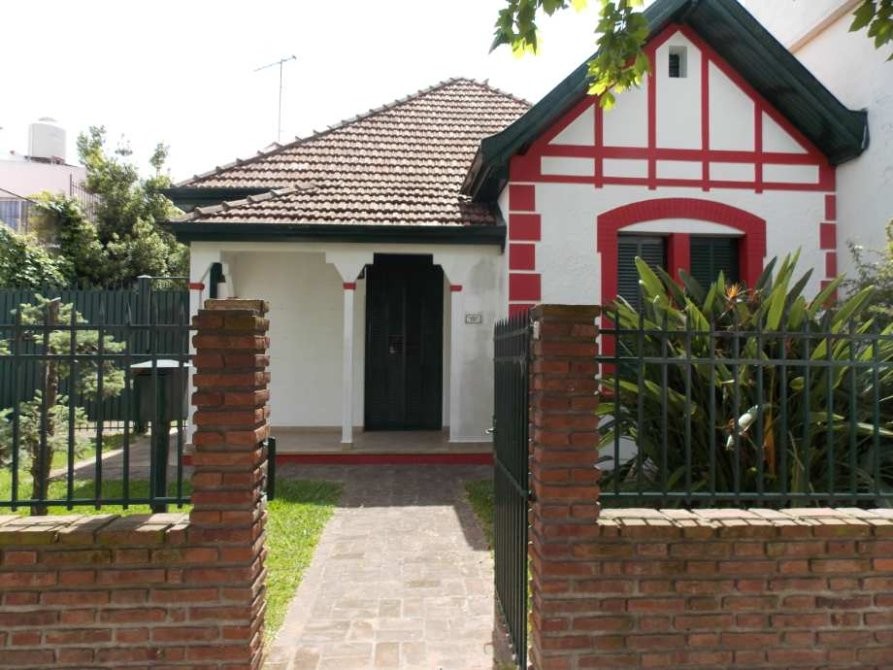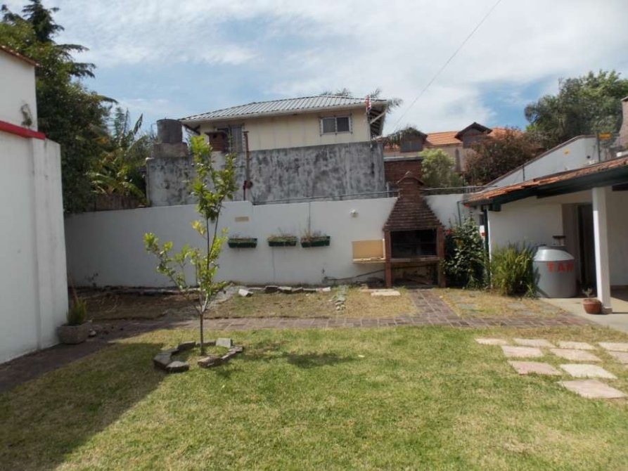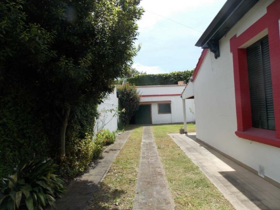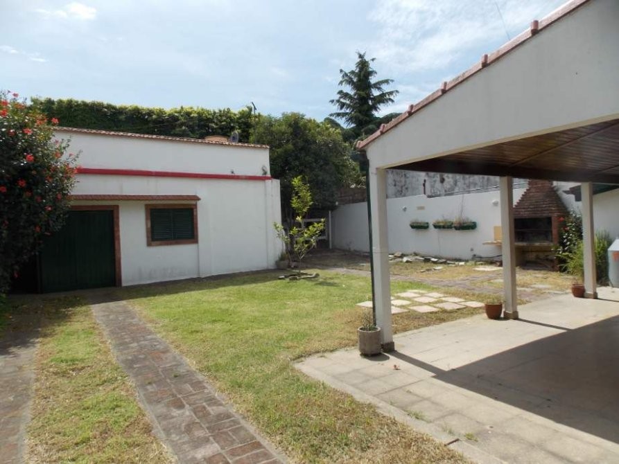 Hermosa propiedad con jardín al frente, entrada de auto pasante, amplio living, baño, dos dormitorios, cocina comedor, galería, patio, lavadero con baño auxiliar, garaje cubierto para tres autos y terraza.